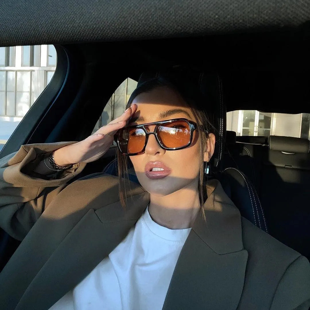 A classic shape with a thick, flat face and thinned temples. Slightly oversized and featuring metal face details and branded temple caps.